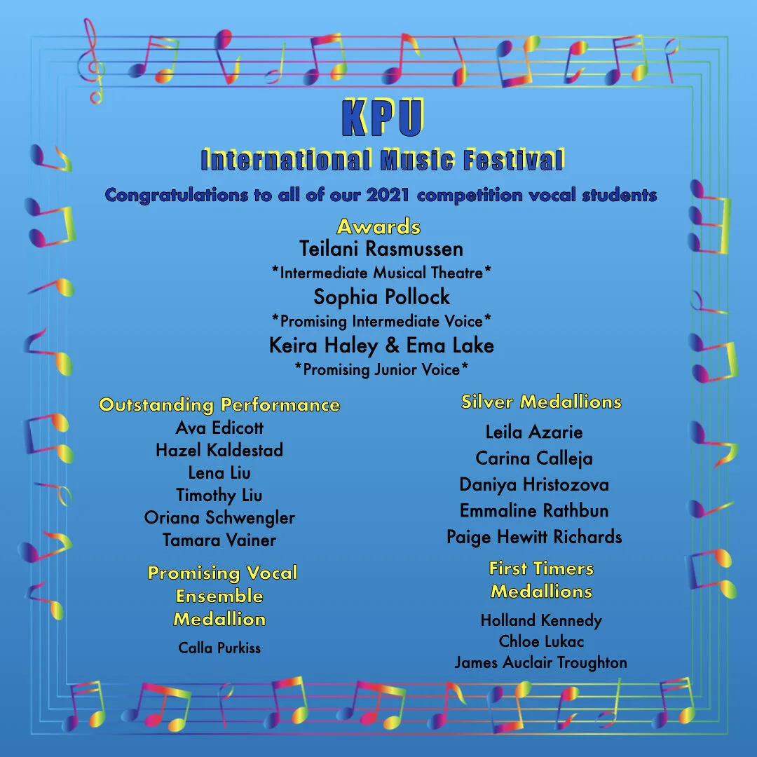 I am so proud of all of my students who submitted to the KPU music Festival. Each and every one of you put so much effort into your performances and that is what counts. Even with all of the obstacles that Covid has thrown at us artists…you powered through.